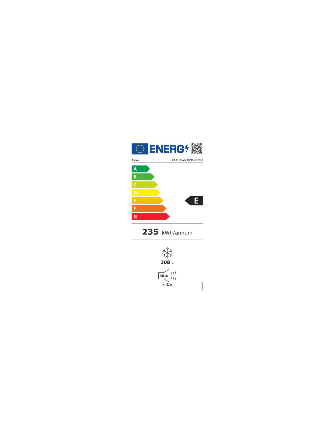 Beko CF316EWN. Capacité net du congélateur: 308 L, Niveau sonore: 40 dB. Emplacement charnière de porte: Haut. Classe d'efficacité énergétique: E, Consommation annuelle d'énergie: 235 kWh. Couleur du produit: Blanc