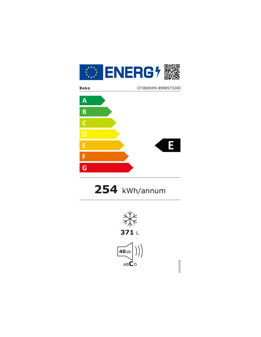 Beko CF380EWN. Capacité net du congélateur: 371 L, Capacité de congélation: 18 kg/24h, Niveau sonore: 40 dB, Nombre d'étoiles (indique les possibilités de conservation): 4*. Emplacement charnière de porte: Haut. Classe d'efficacité énergétique: E, Consommation annuelle d'énergie: 254 kWh. Couleur du produit: Blanc