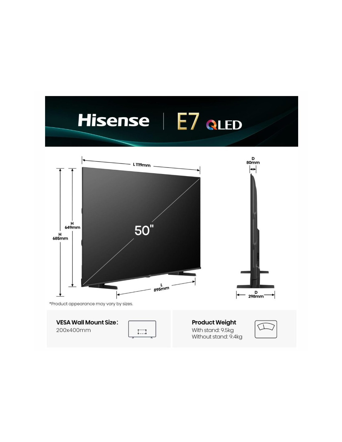 Hisense 50E7Q. Taille de l'écran: 127 cm (50"), Résolution de l'écran: 3840 x 2160 pixels, Type HD: 4K Ultra HD, Technologie d'affichage: QLED, Forme d'écran: Plat. Smart TV. Temps de réponse: 8 ms, Taux de contraste: 4000:1, Format d'image: 16:9. Format du système de signal numérique: DVB-C, DVB-S, DVB-S2, DVB-T, DVB-T2. Wifi, Ethernet/LAN. Couleur du produit: Noir