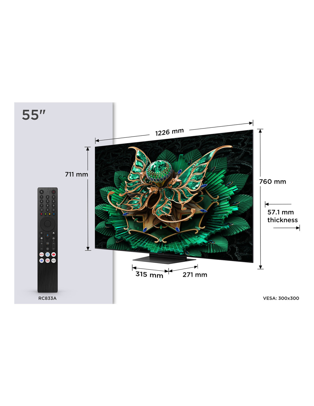 TCL 55C7K. Taille de l'écran: 139,7 cm (55"), Résolution de l'écran: 3840 x 2160 pixels, Type HD: 4K Ultra HD, Technologie d'affichage: QD-Mini LED, Forme d'écran: Plat. Smart TV. Mouvement d'interpolation technologie: PPI (Picture Performance Index) 4600, Luminosité de l'écran: 2600 cd/m², Format d'image: 16:9. Format du système de signal numérique: DVB-C, DVB-S2, DVB-T2. Wifi, Ethernet/LAN. Couleur du produit: Métallique